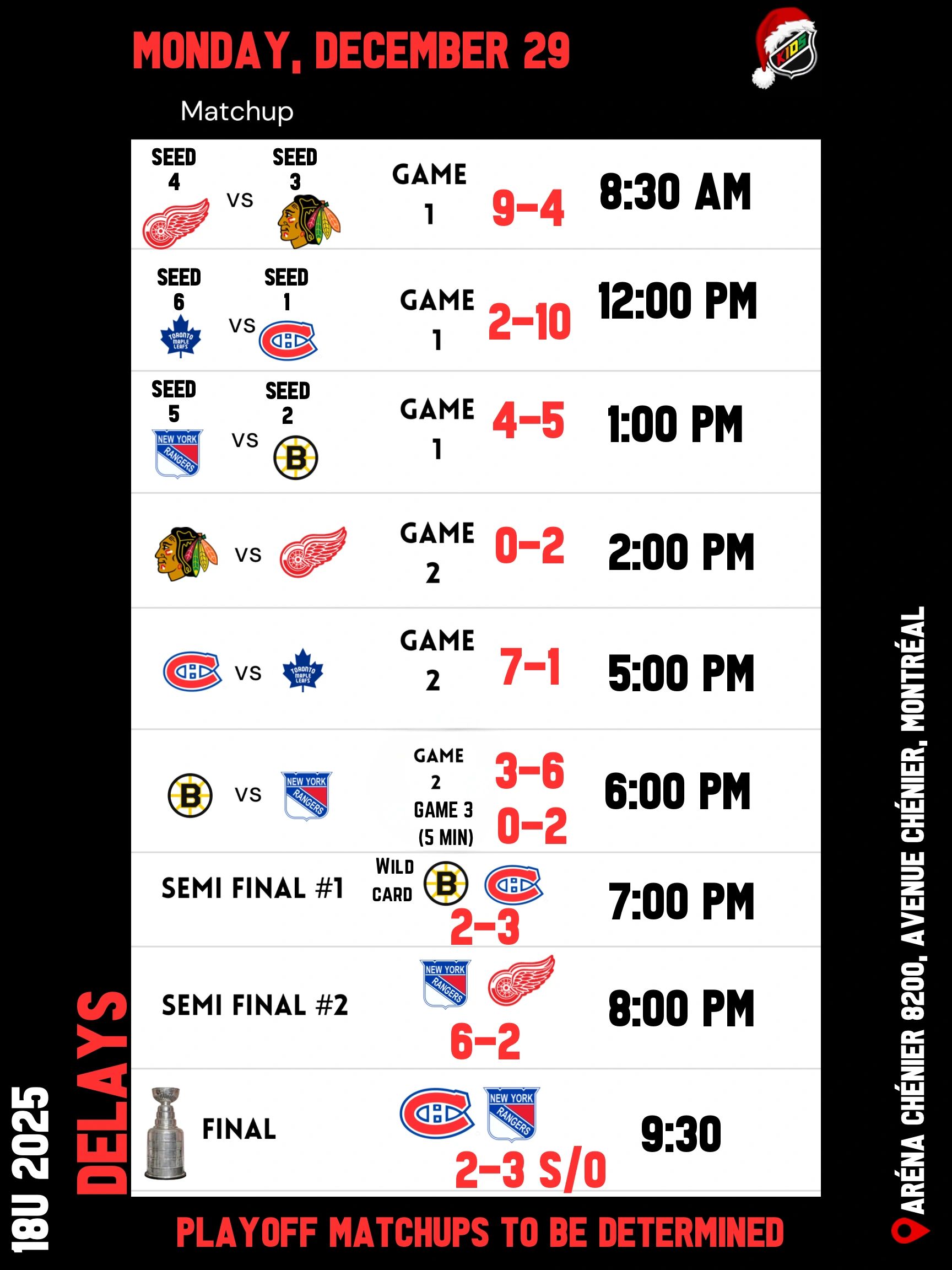 The 18U Original Six Tournament will be held at Aréna Chénier, 8200 Av. Chénier, Anjou, QC H1K 5E9.